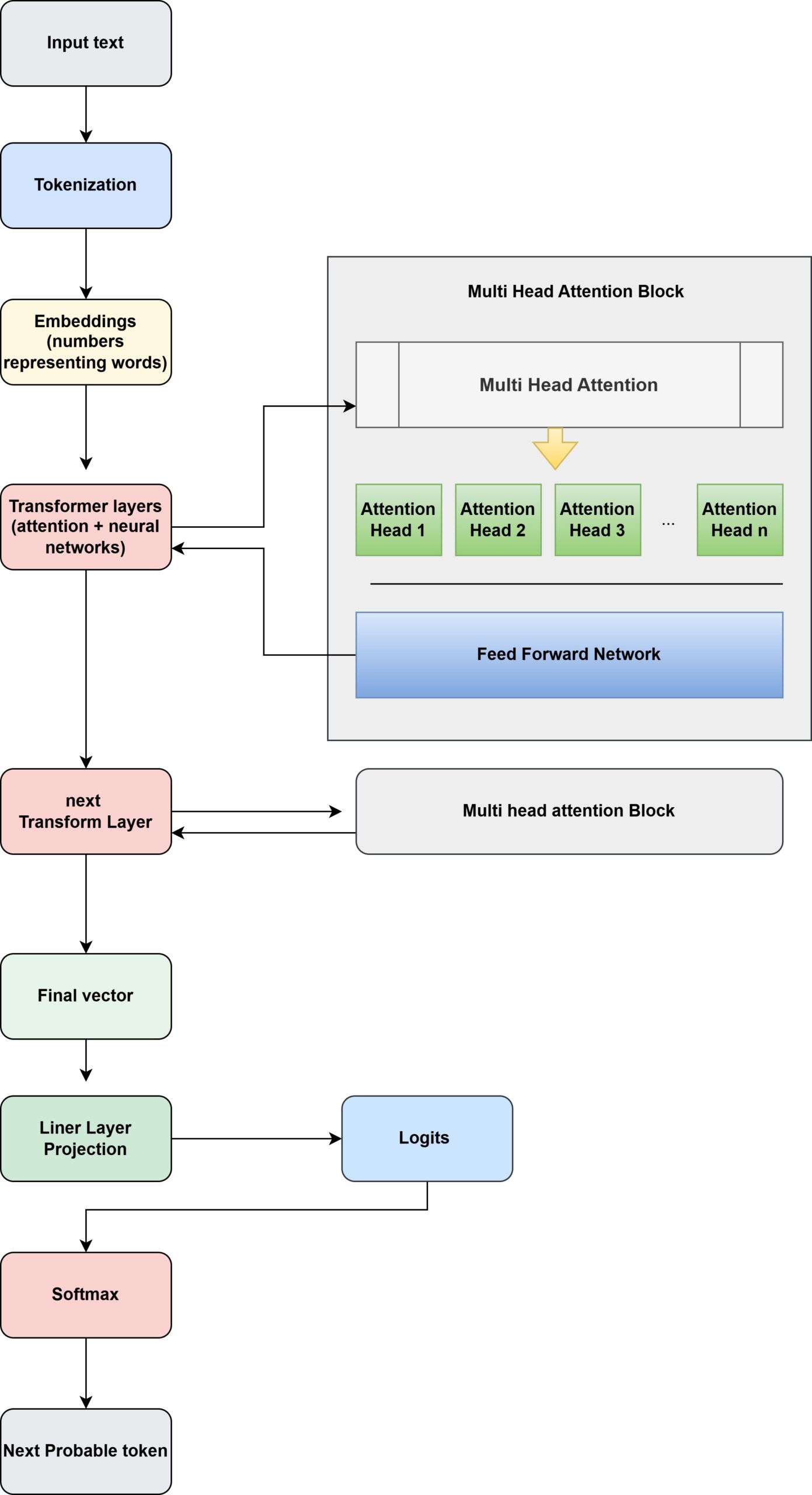 Attention heads operate inside each transformer layer to determine how tokens in the sentence relate to each other before the model predicts the next token.