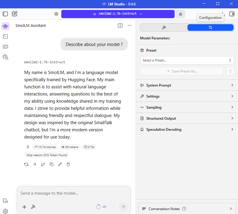 You can now use the SmolLM2-1.7B-Instruct just like any other chatbot. Try asking it to: